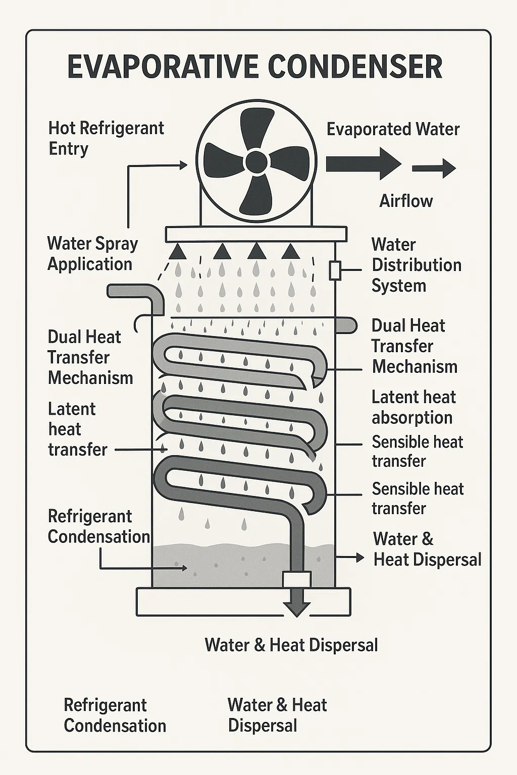 Evaporativni kondenzatori odbijaju toplinu kombinirajući hlađenje zrakom s isparavanjem vode. Za razliku od standardnih kondenzatora koji se oslanjaju isključivo na prijenos topline, oni iskorištavaju latentnu apsorpciju topline tijekom isparavanja vode.