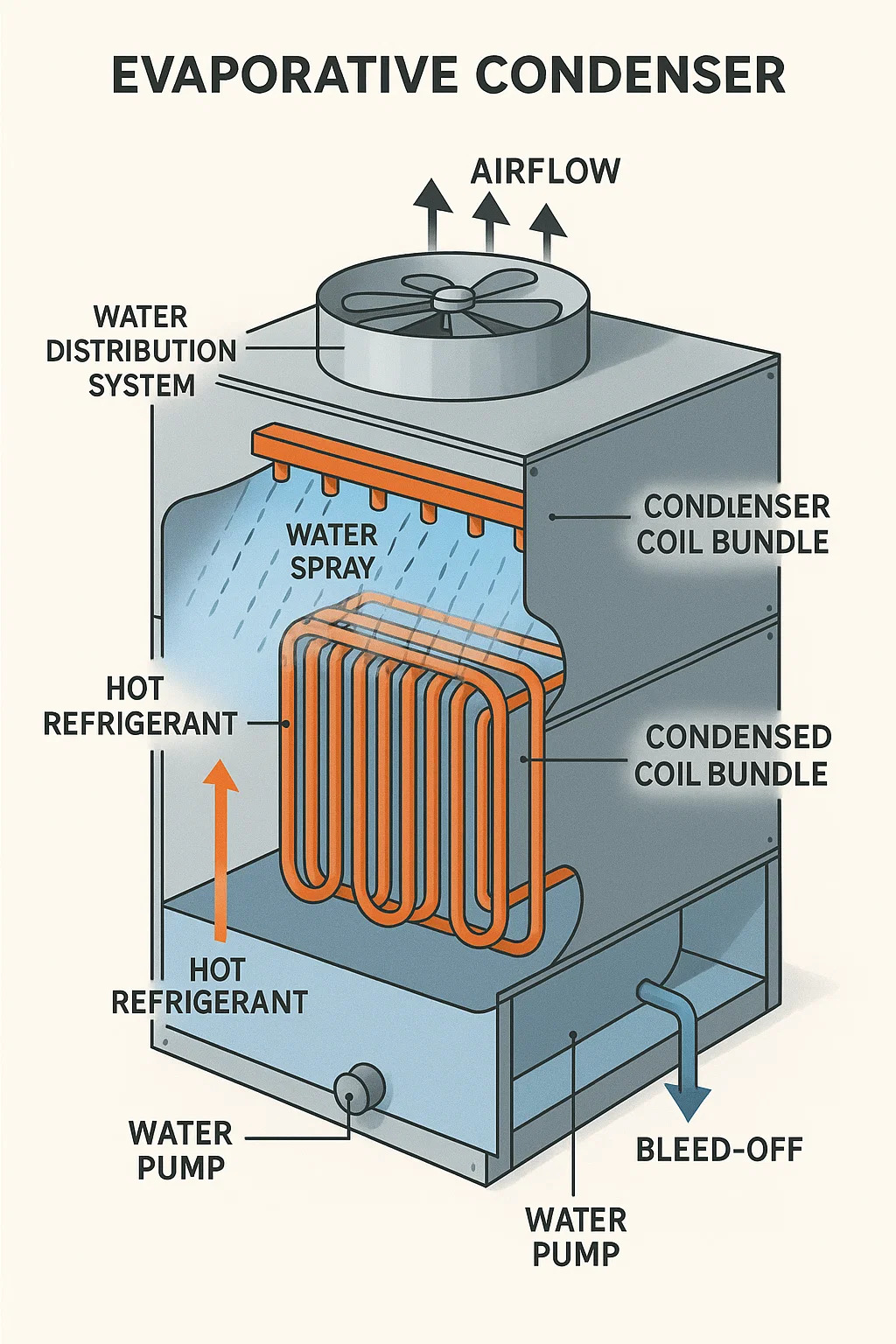 An Isparni kondenzator Integrira zračno hlađenje i isparavanje vode za odbacivanje topline iz rashladnih sustava. Njegov dizajn i rad u osnovi se razlikuju od standardnih kondenzatora s zračnim hlađenjem: