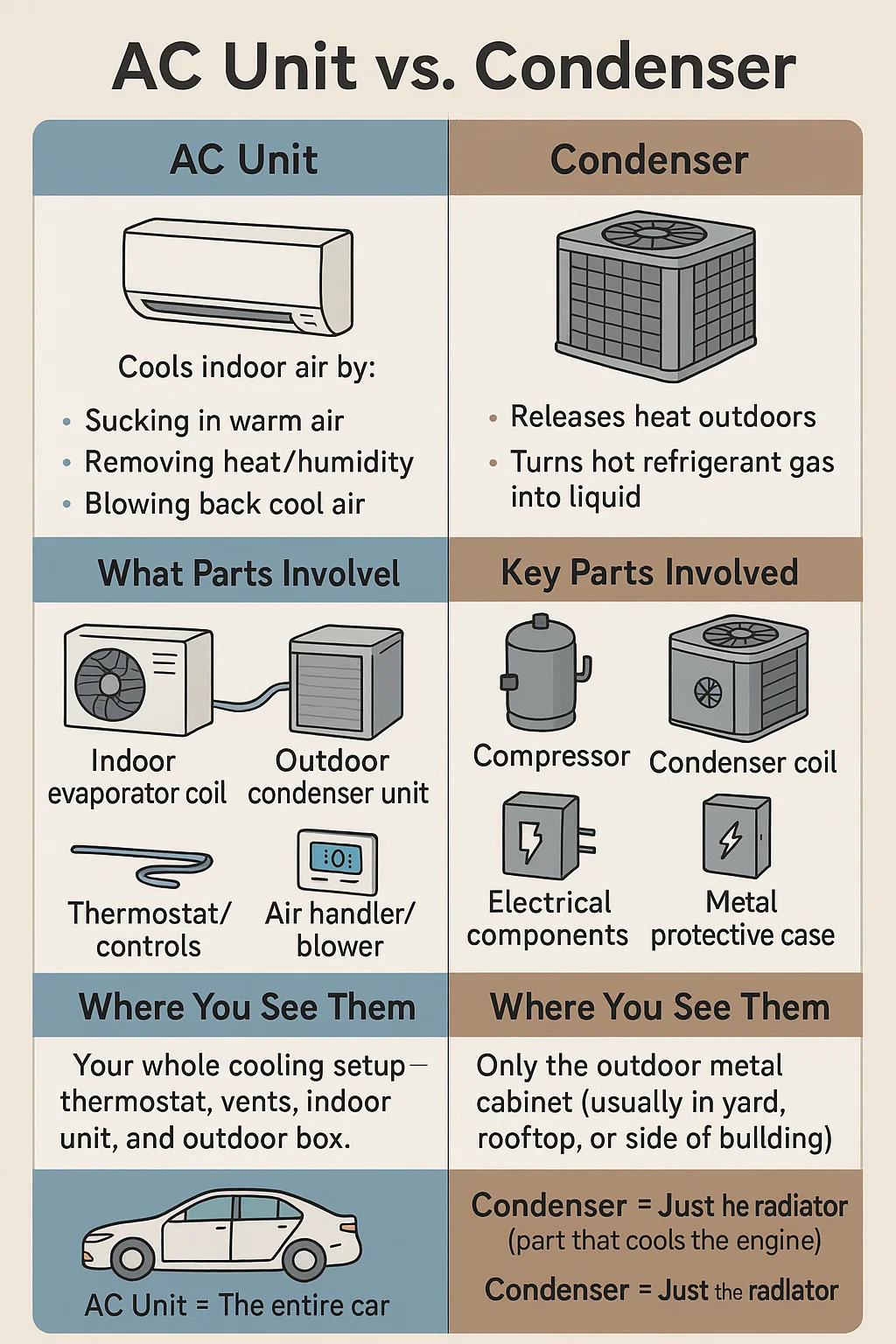 AC jedinica: Odnosi se na cijeli sustav koji hladi vaš dom ili zgradu. Uključuje sve dijelove koji rade zajedno.